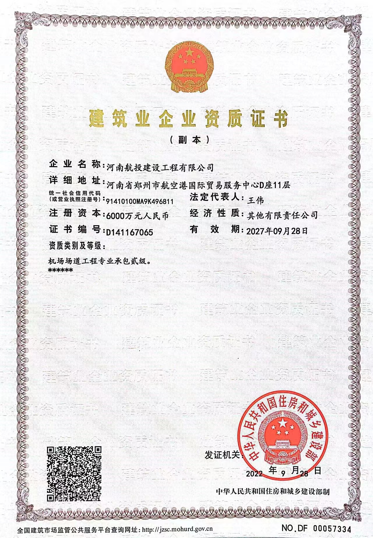 航投建工由河南航投集團旗下河南航投航空基礎產業發展有限公司與貴州省場道工程有限公司共同出資成立。2022年9月28日,航投建工成功取得機場場道工程專業承包二級資質;同年12月8日通過河南省住建廳各項審核,取得《建筑施工企業安全生產許可證》,完成參與市場競爭的全部前置條件;12月23日,被評為鄭州航空港經濟綜合實驗區建筑業重點培育企業,為施工總承包及多項專業資質的取得打下堅實基礎。