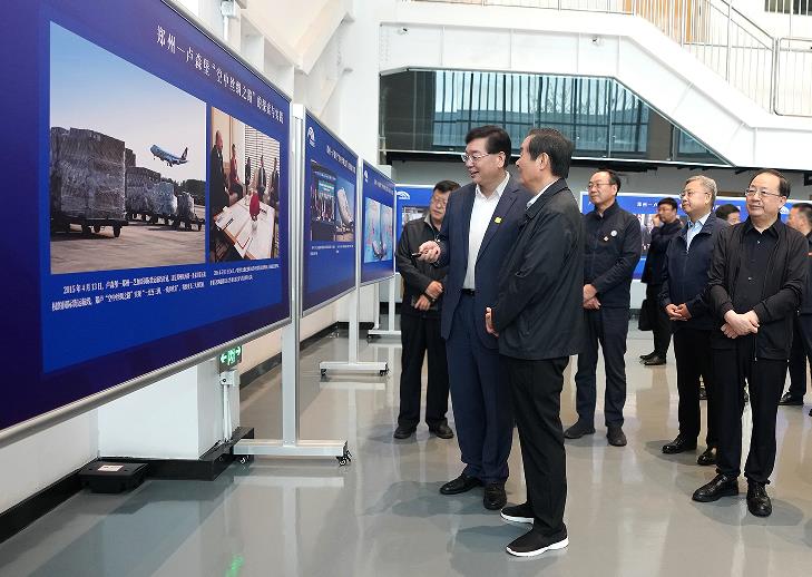 在位于鄭州航空港區的航投培訓中心,劉奇葆首先參觀了“鄭盧‘空中絲綢之路’的探索與實踐”圖片展。張明超詳細介紹了35張圖片背后的故事和內涵,匯報了“一帶一路”框架下鄭盧“空中絲路”的建設歷程和發展現狀。