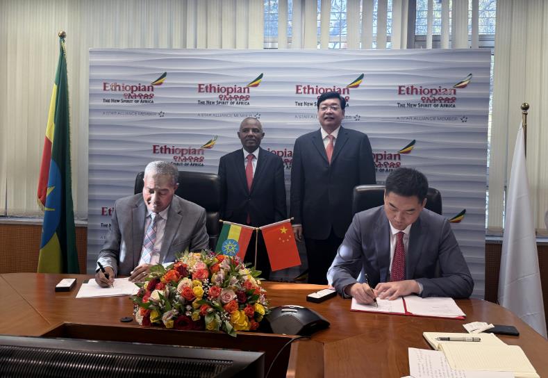 當(dāng)天下午,中豫航空集團(tuán)與埃塞俄比亞航空集團(tuán)在亞的斯亞貝巴簽署合作備忘錄,就深化航空貨運(yùn)業(yè)務(wù)合作、推動(dòng)航空領(lǐng)域全方位合作達(dá)成一致意見。張明超和埃塞俄比亞航空集團(tuán)首席執(zhí)行官M(fèi)esfin Tasew共同見簽。根據(jù)約定,雙方將發(fā)揮各自的區(qū)位、航線、貨源等資源優(yōu)勢(shì),共同推進(jìn)增開中非貨運(yùn)航線,開展貨運(yùn)中轉(zhuǎn)等業(yè)務(wù),探索在海外貨站、機(jī)務(wù)維修、航空培訓(xùn)、仿真模擬設(shè)備研發(fā)制造、航空金融服務(wù)、航空基礎(chǔ)設(shè)施建設(shè)等方面開展合作。簽約前,中豫航空集團(tuán)代表團(tuán)與Mesfin Tasew圍繞鄭州—亞的斯亞貝巴“雙樞紐”建設(shè)溝通會(huì)談。張明超表示,埃塞俄比亞位于非洲、中東和亞洲的十字路口,地理位置優(yōu)越;埃塞俄比亞航空公司客貨運(yùn)服務(wù)全球覆蓋廣泛,是非洲領(lǐng)先的航司之一,雙方優(yōu)勢(shì)互補(bǔ)、合作前景廣闊。中豫航空集團(tuán)將扎實(shí)推進(jìn)與埃塞俄比亞航空集團(tuán)的全鏈條業(yè)務(wù)合作,復(fù)制鄭盧“雙樞紐”建設(shè)經(jīng)驗(yàn),為兩地經(jīng)貿(mào)往來開辟新通道。Mesfin Tasew介紹了埃塞俄比亞航空集團(tuán)的基本情況。他說,埃塞俄比亞航空集團(tuán)愿攜手中豫航空集團(tuán),共同致力“雙樞紐”建設(shè),通過空中走廊把更多的中國(guó)商品輸入非洲,也將更多的非洲產(chǎn)品運(yùn)送到中國(guó)和世界各地。簽約后,代表團(tuán)一行實(shí)地調(diào)研了埃塞俄比亞航空貨站和維修中心。
