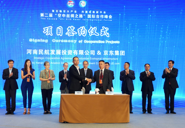 在隨后的成果發(fā)布環(huán)節(jié),河南航投總經(jīng)理、黨委副書記、副董事長劉建葆代表公司分別與中航通用飛機(jī)有限公司(以下簡稱航空工業(yè)通飛)、法國Simaero控股公司、中國檢驗(yàn)認(rèn)證(集團(tuán))公司(以下簡稱中檢集團(tuán))、京東集團(tuán)簽署戰(zhàn)略合作協(xié)議。黃強(qiáng)及中外嘉賓代表見簽。趙磊主持發(fā)布圖書《“一帶一路”高質(zhì)量發(fā)展——河南“空中絲綢之路”的生動(dòng)實(shí)踐》。該書以紀(jì)實(shí)筆觸全方位記錄了河南主動(dòng)融入“一帶一路”建設(shè),向天尋路,架起一條互利各國交通運(yùn)輸、聚合經(jīng)貿(mào)文化發(fā)展的“空中絲綢之路”,真實(shí)展現(xiàn)出河南打造內(nèi)陸開放新高地、實(shí)現(xiàn)中原更出彩的新局面。